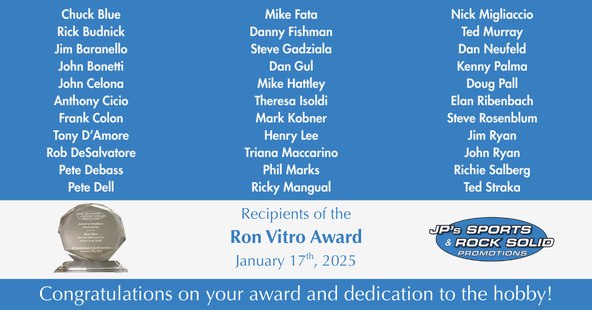 What does the Ron Vitro award stand for? Well, a lot of things. It means in the opinion of JPRS, this dealer is someone who stands out from the other dealers by naturally demonstrating the following business practices. Being a mentor to other dealers within the industry, including industry knowledge, fair business practices and friendly advice. Viewed as a leader in their sector of business by not only us but other dealers. Exemplifies fair business practices with the public and dealers and/or social media. An inspiring person and advocate for hobby. You’re an asset to our shows by simply being here. It’s essentially our Hall of Fame. The reward was retired on January 18th, 2025.